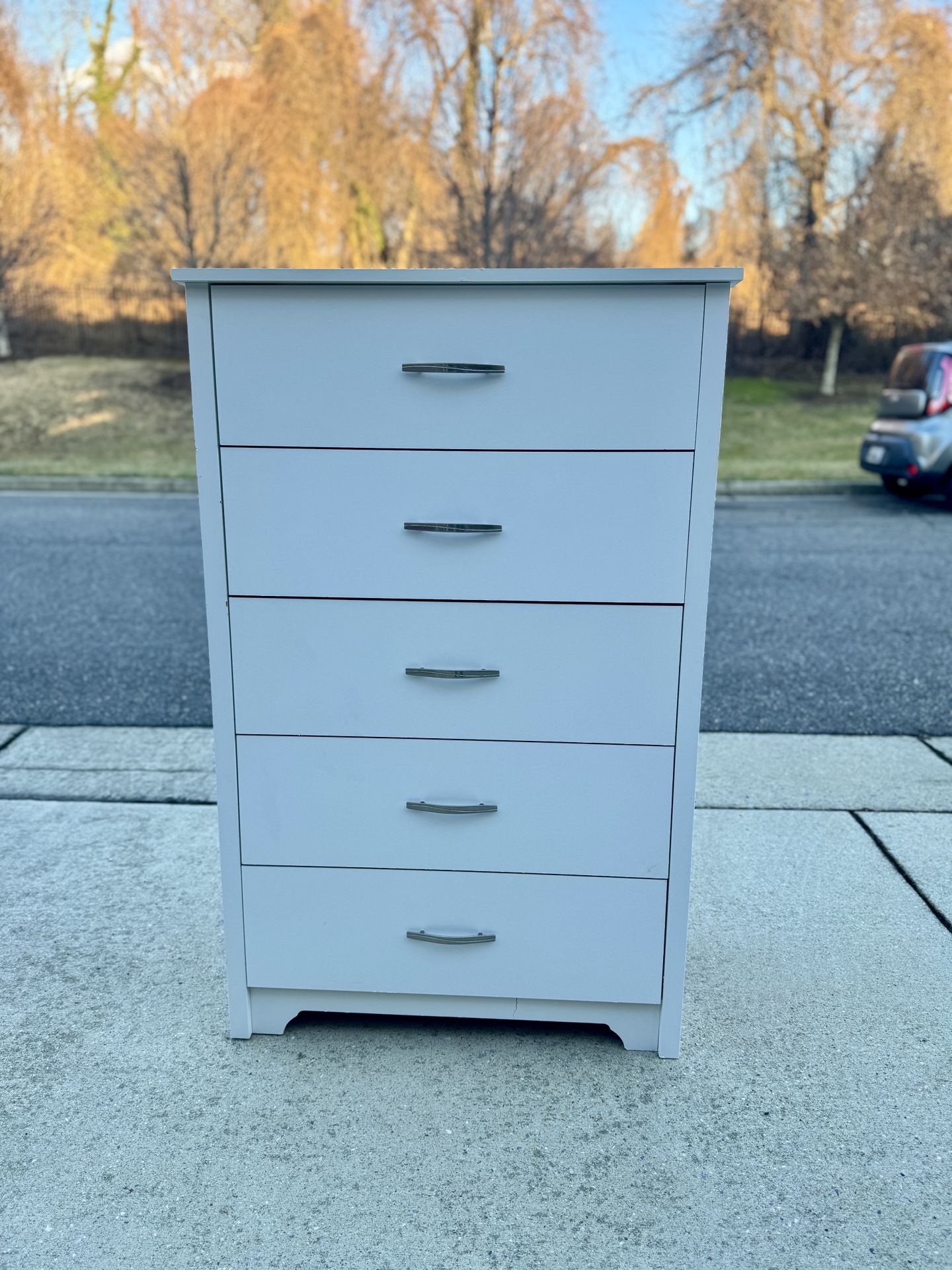Clean and simple tall dresser with five spacious drawers and sleek silver handles. Great for maximizing storage in smaller bedrooms or closets. π Minor cosmetic wear at the bottom (see photo) β does not affect use. Drawers open smoothly and interior is clean.