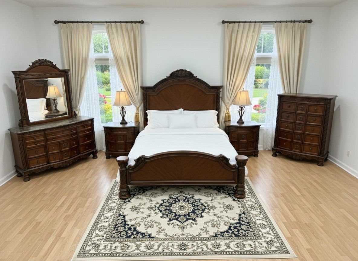 King bedroom set used in Great condition real solid wood and marble tops PRICE FIRM I can do deliver $50 put everything in garage only Incluide bed frame Dresser Mirror two night stands and chest. No mattress or box spring Recamara King usada en excelentes condiciones Madera solida y marmol Puedo hacer entrega Por 50 de gasolina solo descargo en el garage no incluye colchones