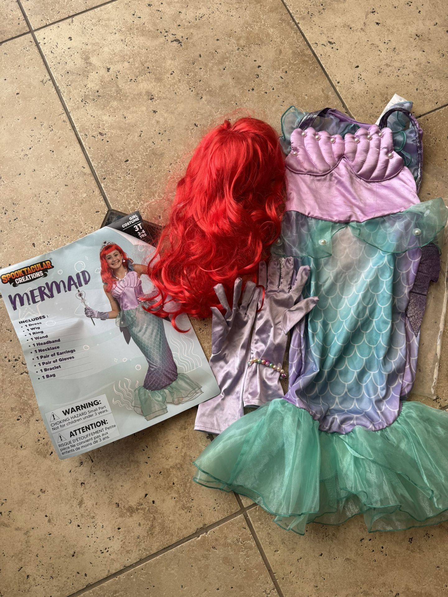 (Ariel costume) Could use a wash or spot clean on the dress but super cute for the halloween holiday Possibly fits 2, 3, 4, 5 year old. My daughter tried it on again and fits and she is 5.