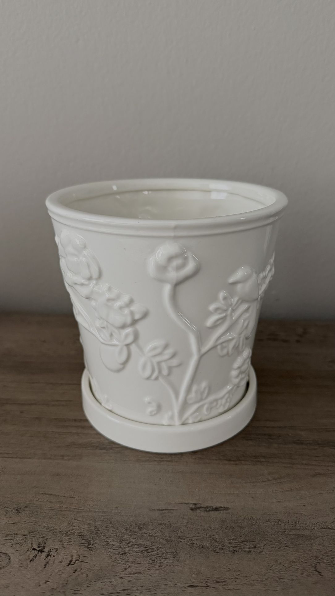 Elegant white ceramic planter with a raised floral design. Comes with a matching saucer to catch excess water. Clean, well-kept condition with no cracks or chips.