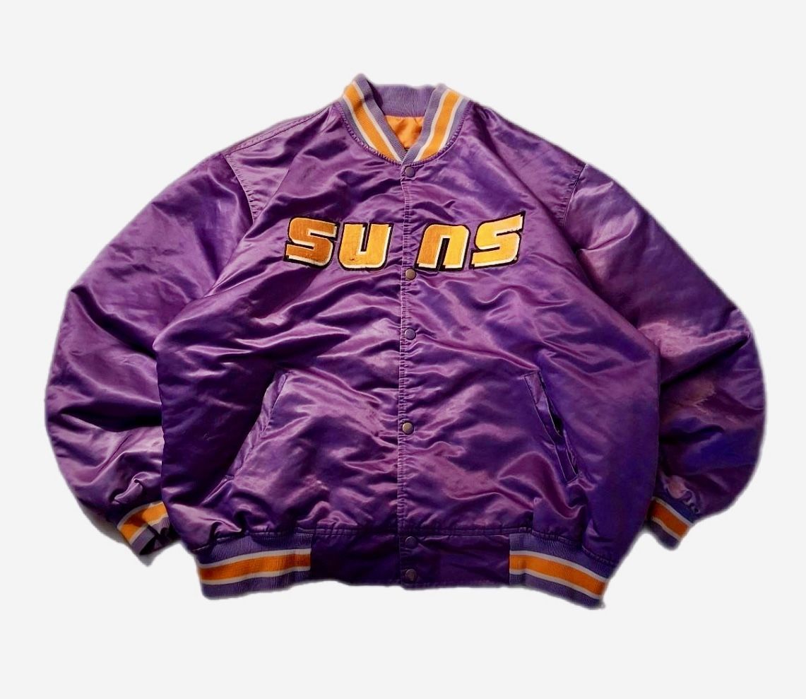 The product is a vintage Starter Phoenix Suns jacket from the 90s, officially licensed by the National Basketball Association (NBA). This purple jack