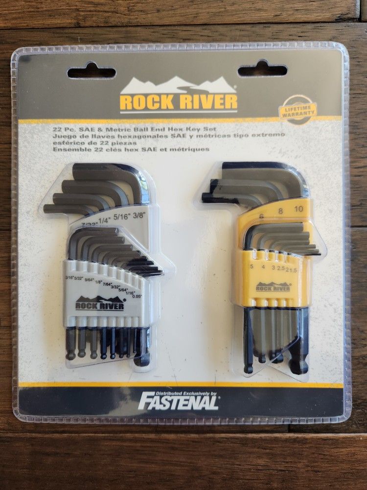 Retail $45+ Hex Key Set-SAE & Metric, 22pc-Hex Ball End Drive-Long Arm-CRV Alloy Steel Precision made to fit hexagonal fastener screw heads, Key designed to provide maximum strength at point of inserting and removal of fastener head. Fold Over case act as T handle transferring more torque to the fastener head to maximize performance. Heat Treated for maximum performance and durability. Used for inserting and removal of hexagonal head fasteners