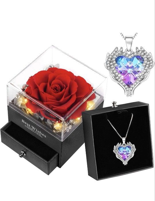 Brand new Preserved Rose with Angel Wings Heart Necklace Gifts for Girlfriend Valentine's Day Gift