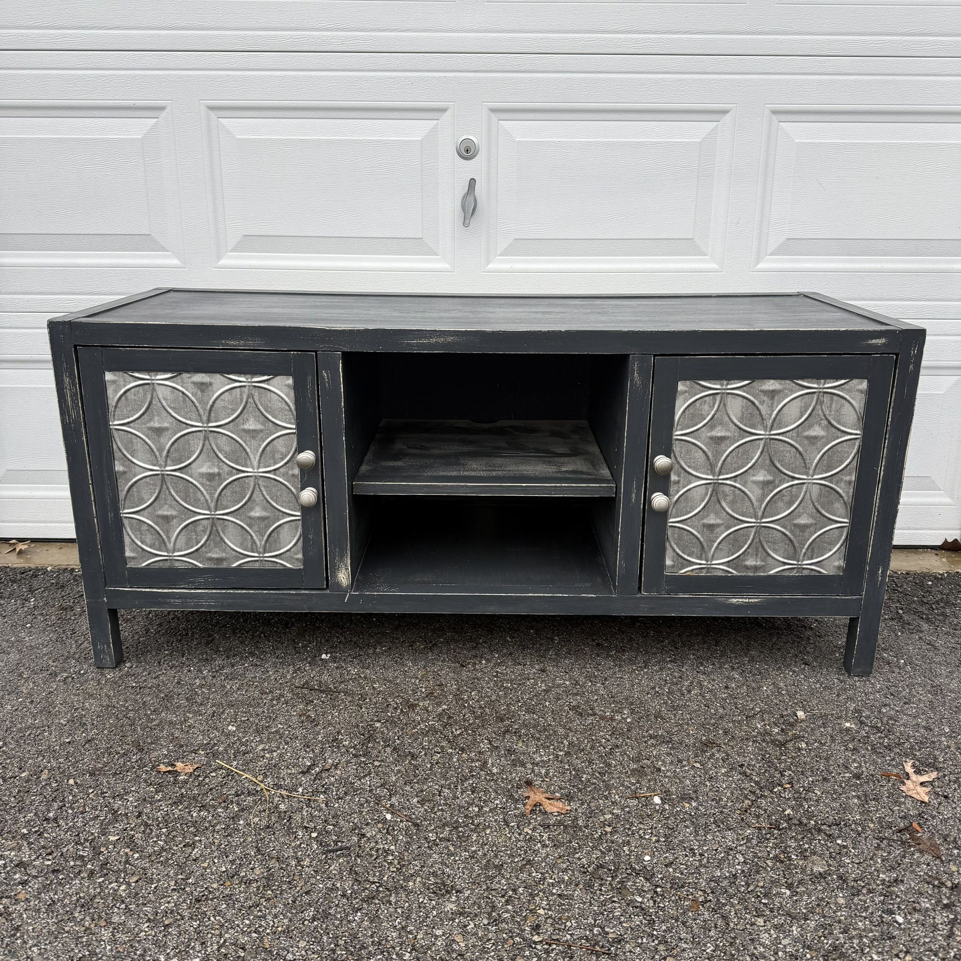 Media cabinet console table Tv stand. Has 2 storage cabinets. Center media area with adjustable/ removable shelf and power cable hole. Measures 54” wide x 20” deep x 24” tall. Delivery available.