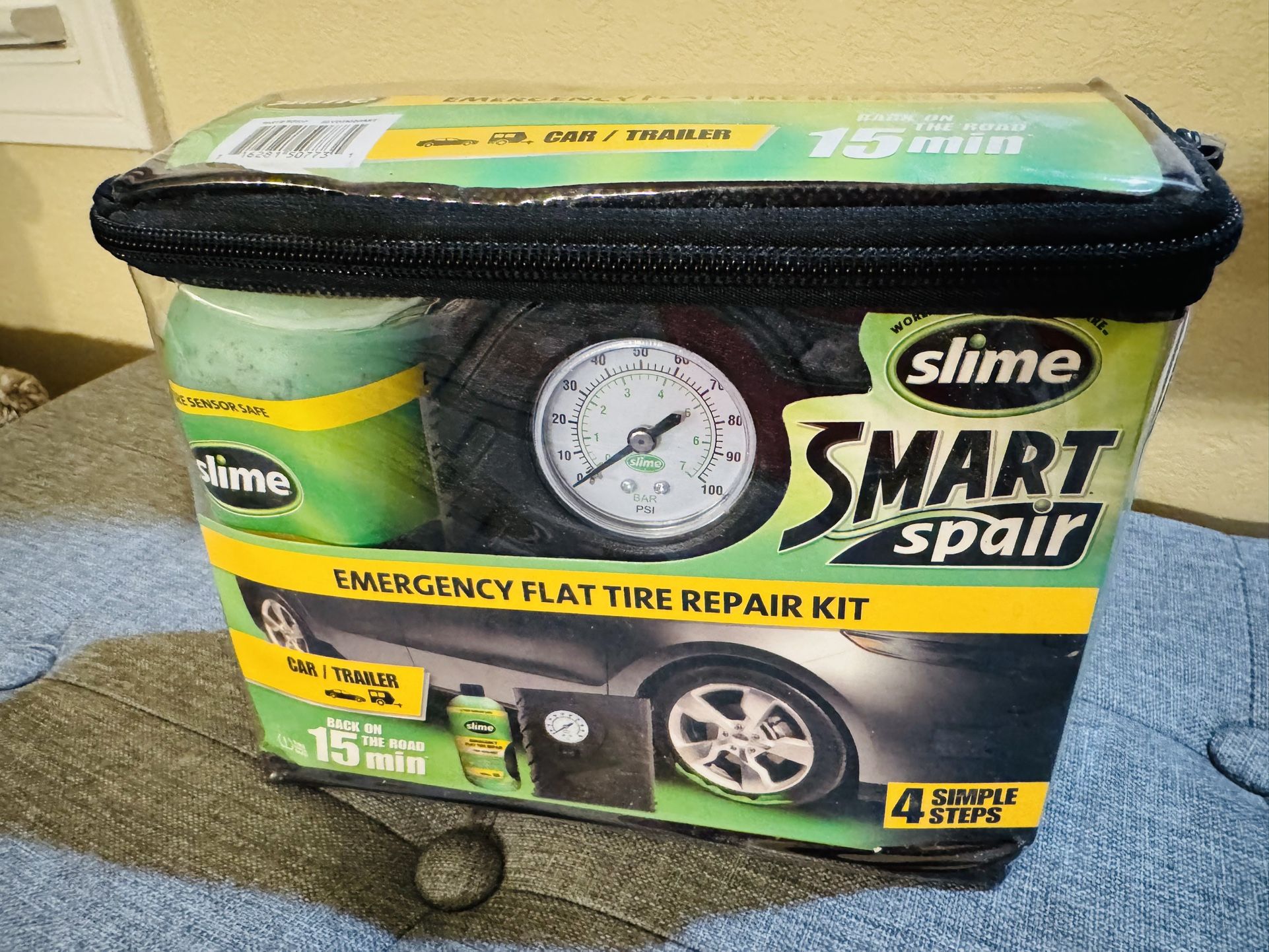 Brand new Slime Smart Spair tire repair kit. Never opened, never unzipped. Full kit includes the tire inflator, 16oz sealant bottle, adapters, and storage case. Good backup for your car or trailer. Still sealed from the store. Keywords • slime smart spair • tire repair kit • flat tire emergency • tire inflator • tire sealant • car emergency kit • trailer tire repair • auto accessories • slime kit • roadside emergency