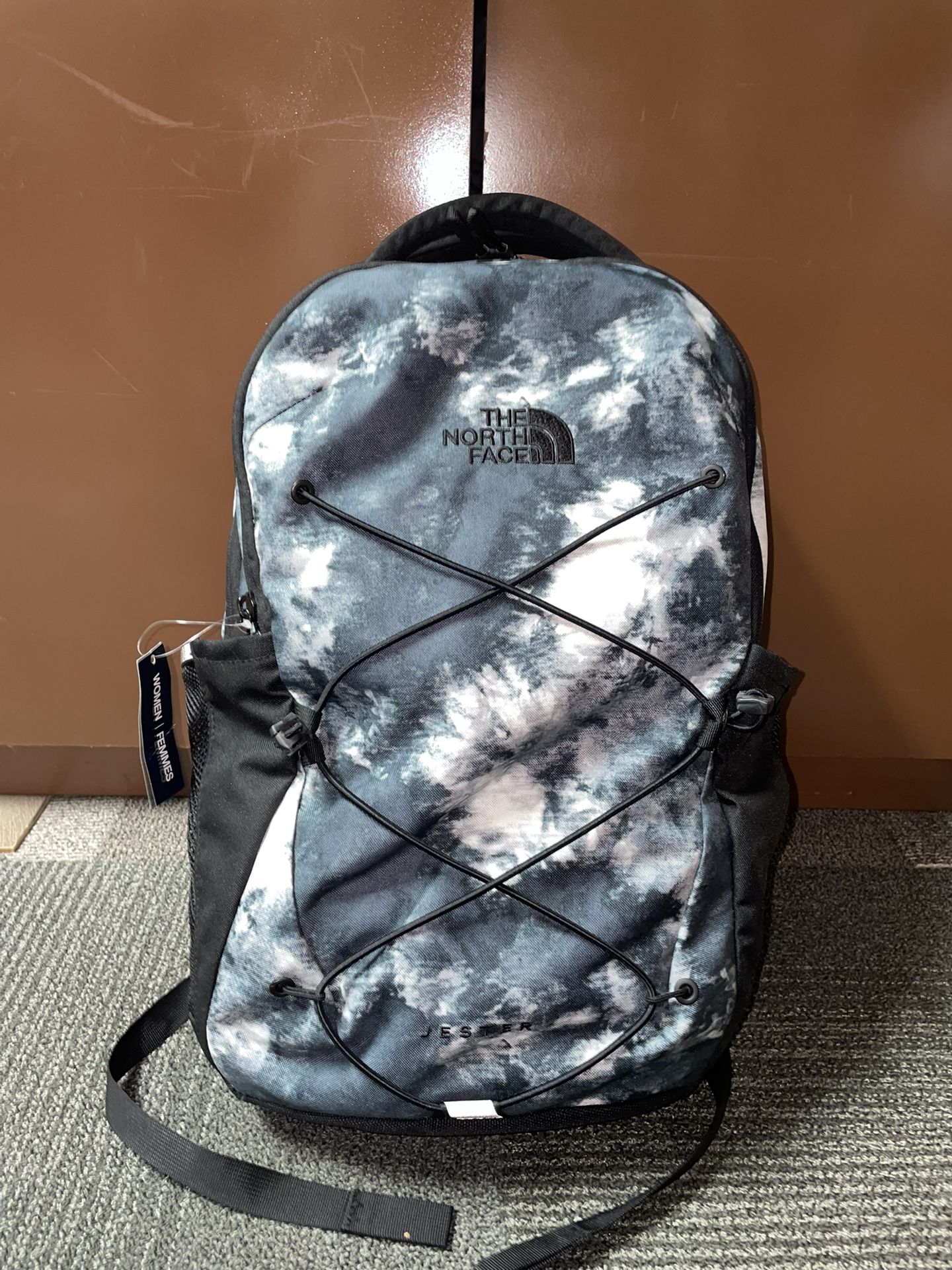 Brand New with Tags The North Face Women’s Jester backpack Black White and grey tie dye Can Be used as A Men’s Backpack Aswell But it is A Women’s backpack shown features a front bungee system for storage, a padded laptop sleeve, and a stand-up design.