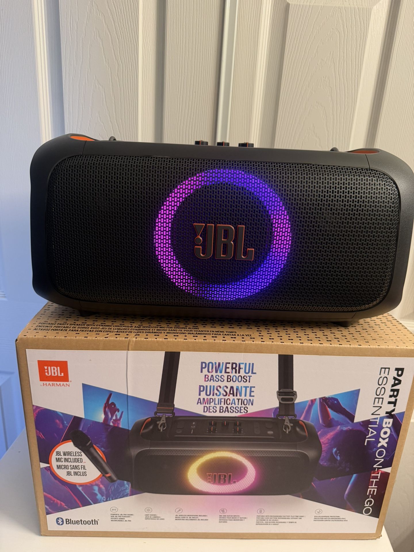(YOU WILL GET A BRAND NEW SPEAKER NEVER BEEN USED IN A FACTORY SEALED BOX) Brand New and Sealed JBL PartyBox On-The-Go Essential is a portable party speaker featuring powerful JBL Pro Sound, synced lightshow, rechargeable battery, handy shoulder strap and wireless microphone and guitar input All Accessories Included, FIRM PRICE/ PICK UP AND CASH ONLY/PICK UP IN SANTA ANA