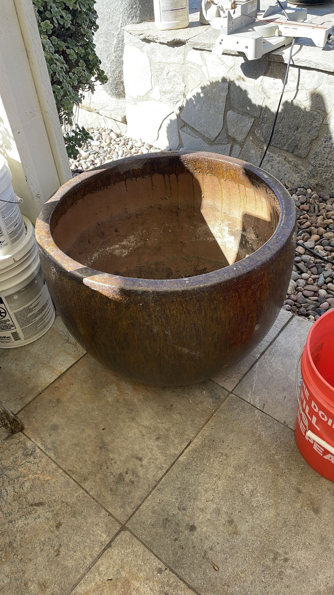 4 large planters $250 each, Paid $1100 each. These are large heavy clay with brown glaze approx 25/30gal