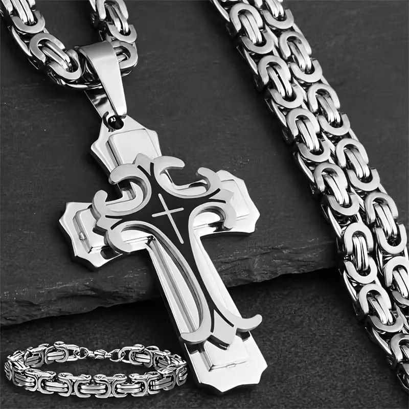 3-Pcs Uniquely Crafted Multi-layer Black Silver Cross Pendant With Byzantine 24" Necklace & Bracelet