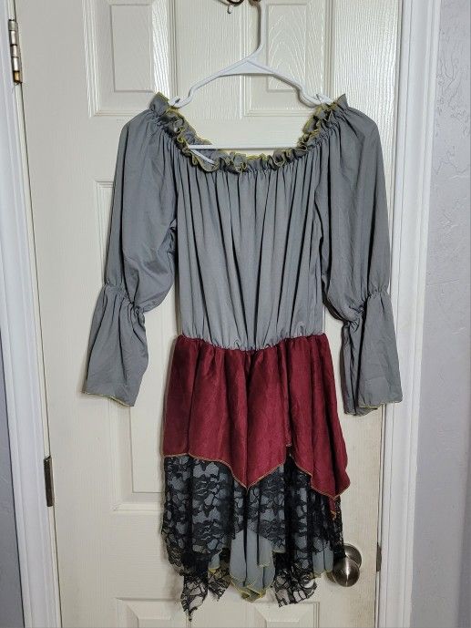Used, still good condition, 3 Pc Pirate Halloween Costume. Includes pirate dress, long tail vest with attached cross belt and plastic toy dagger weapon. Asking $13. Fits adult size Medium. Disfraz de pirata para party fiesta de halloween.