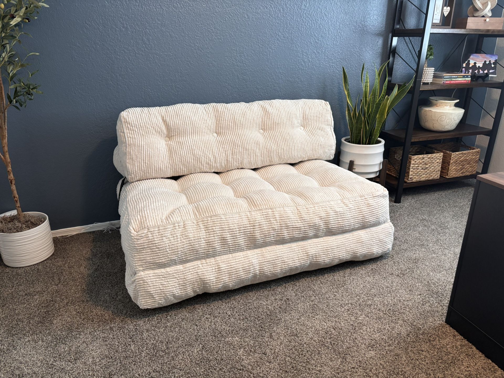 MAXYOYO Folding Sofa Bed, Convertible Sleeper Chair with Pilow Foldable Matress with Back Support, Portable Fold Out Chair Bed Comfy Floor Sofa Lounge for Living Room Bedroom, Beige, Double Brand new from Amazon. Only sat on once by my daughter home from college. Never slept on. Just decided to do something else with the room. In perfect condition.