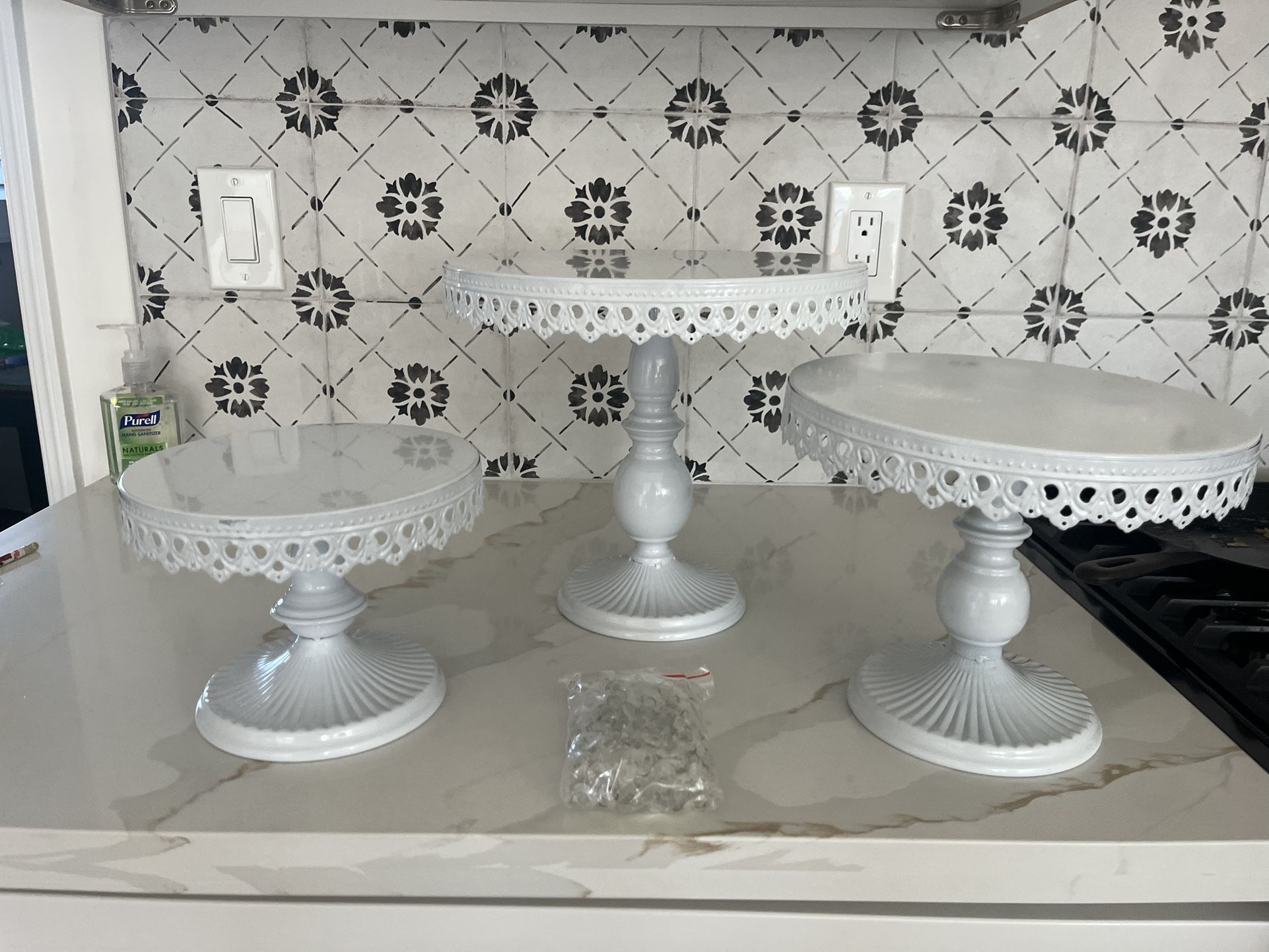 3 white metal cake stands and comes with clear gems that can hang down. Brand new. Bought but never used afterall.