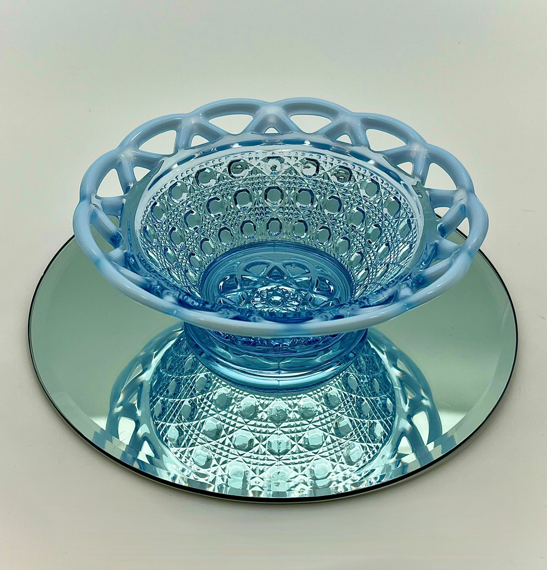 1940’s Imperial Glass Katy Blue Opalescent Lace Edge Lattice And Cane Accent Bowl