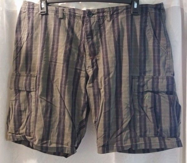 Patagonia Cargo Shorts sz 40. Navy blue & dark gray striped pattern. Hand pockets, flap over button closure on back pockets & cargo pockets, button closure, zipper fly. Waist measures 40", 10" inseam, 20" long (waist to hem). Nice condition, 100% organic cotton. Waterford p/u, no holds, poos.