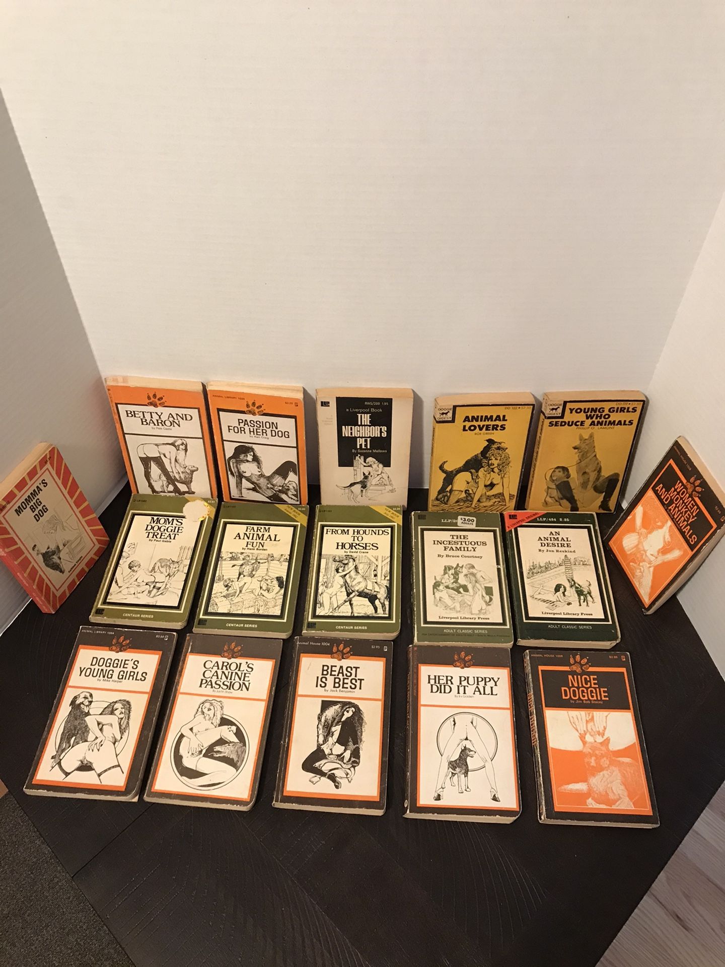 There are 17 sexually explicit adult themed novels / books featuring stories involving women and animals listed. Sold all together. All books from the 70’s and 80’s. All in good condition. No stains, etc. These are basically collectors items in the adult entertainment collectibles genre. Price is firm.
