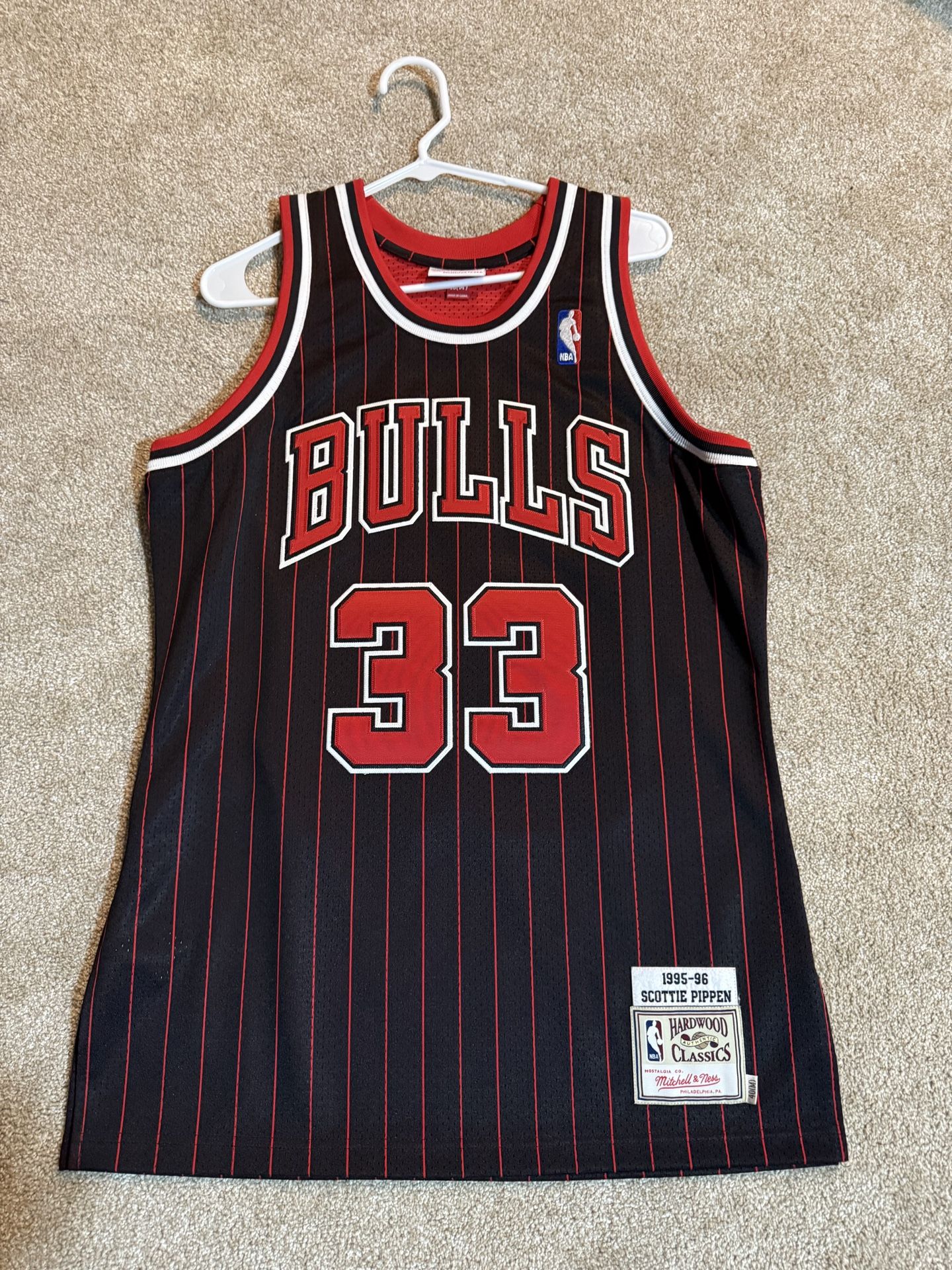 The Mitchell & Ness Chicago Bulls Scottie Pippen Hardwood Classics Jersey in size 40 (M) is an officially licensed basketball jersey featuring the iconic player's name and number. The jersey comes in classic black and red colors, representing the historic Chicago Bulls team. Perfect for any NBA fan looking to show their support for the legendary Scottie Pippen and the Bulls in style.
