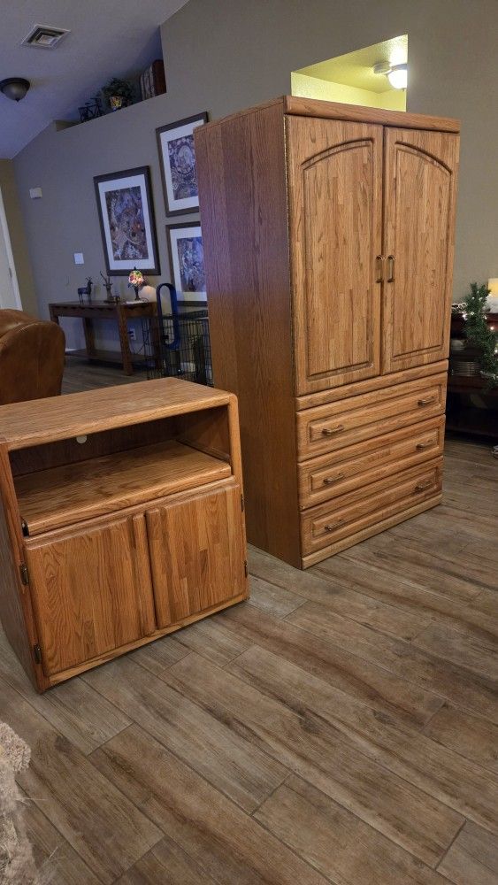 Oak in good condition. I am willingly to sell separately. $60 for the Armoire & $30 for the cabinet.