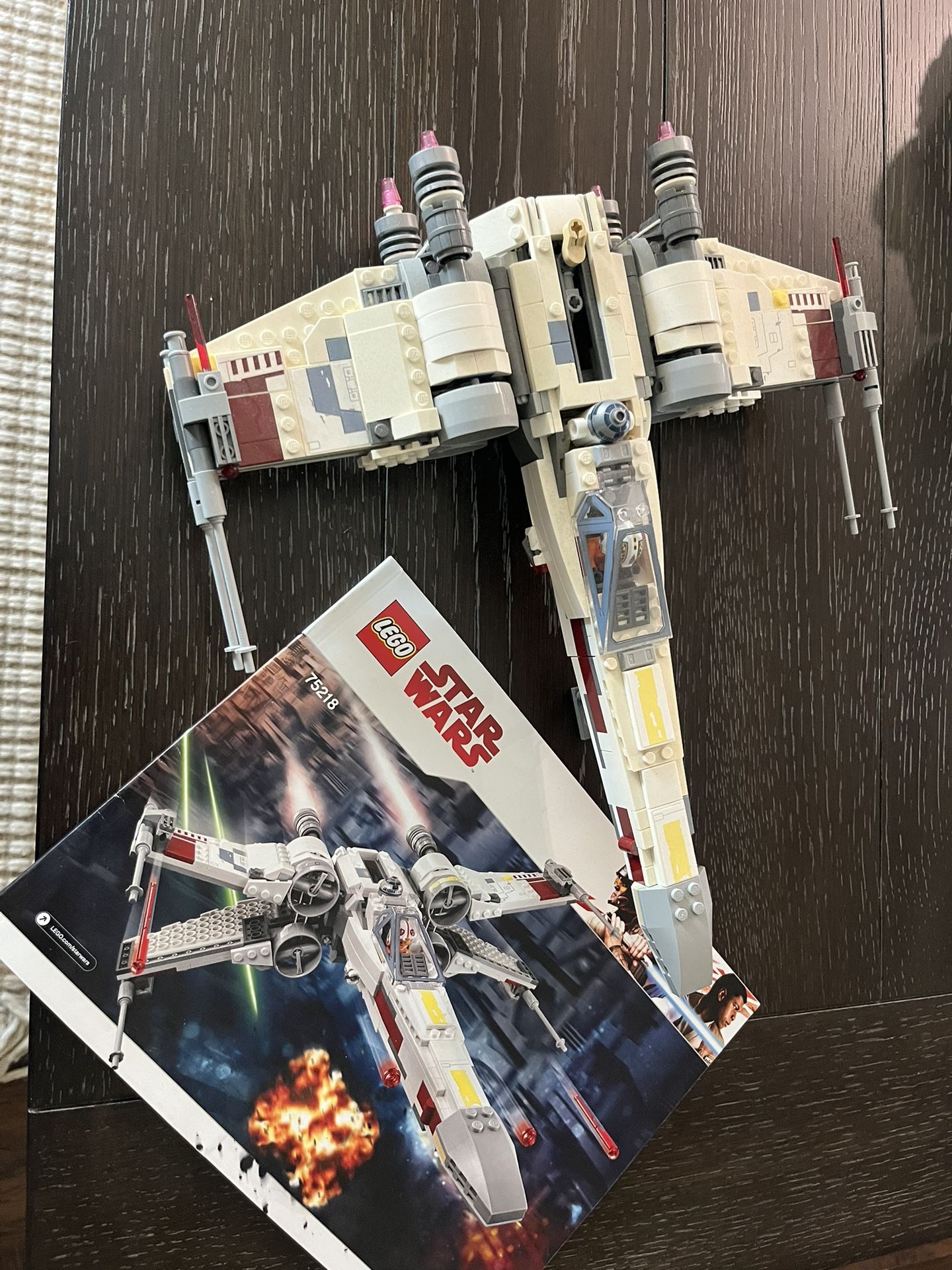 Lego Star Wars X wing fighter jet. Already built but can be torn apart and rebuilt. Introduction manual included. Part number 75218