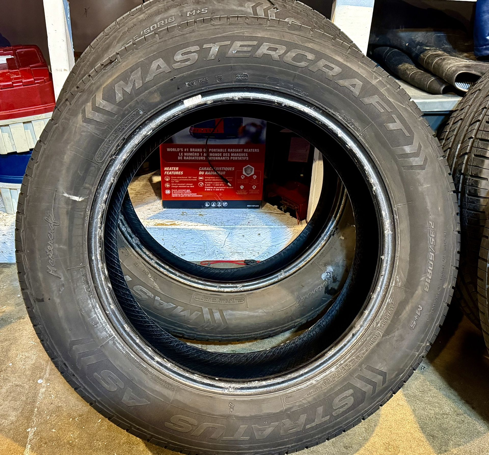 I have x4 MasterCraft Stratus All Season tires. New is 9/32 tread. Set of 4 new is $332. Was mounted on a 2013 Honda Pilot. One of my wheel bearings went bad which caused extra wear one on tire. I opted to have all 4 replaced instead of just replacing the one worn one.. the 3 at 7/32 is about 80% life or so. Asking just $75 bucks for the set. Located and pick up in federal way area. Tire 1 - 7/32 Tire 2 - 7/32 Tire 3 - 7/32 Tire 4 - 4/32