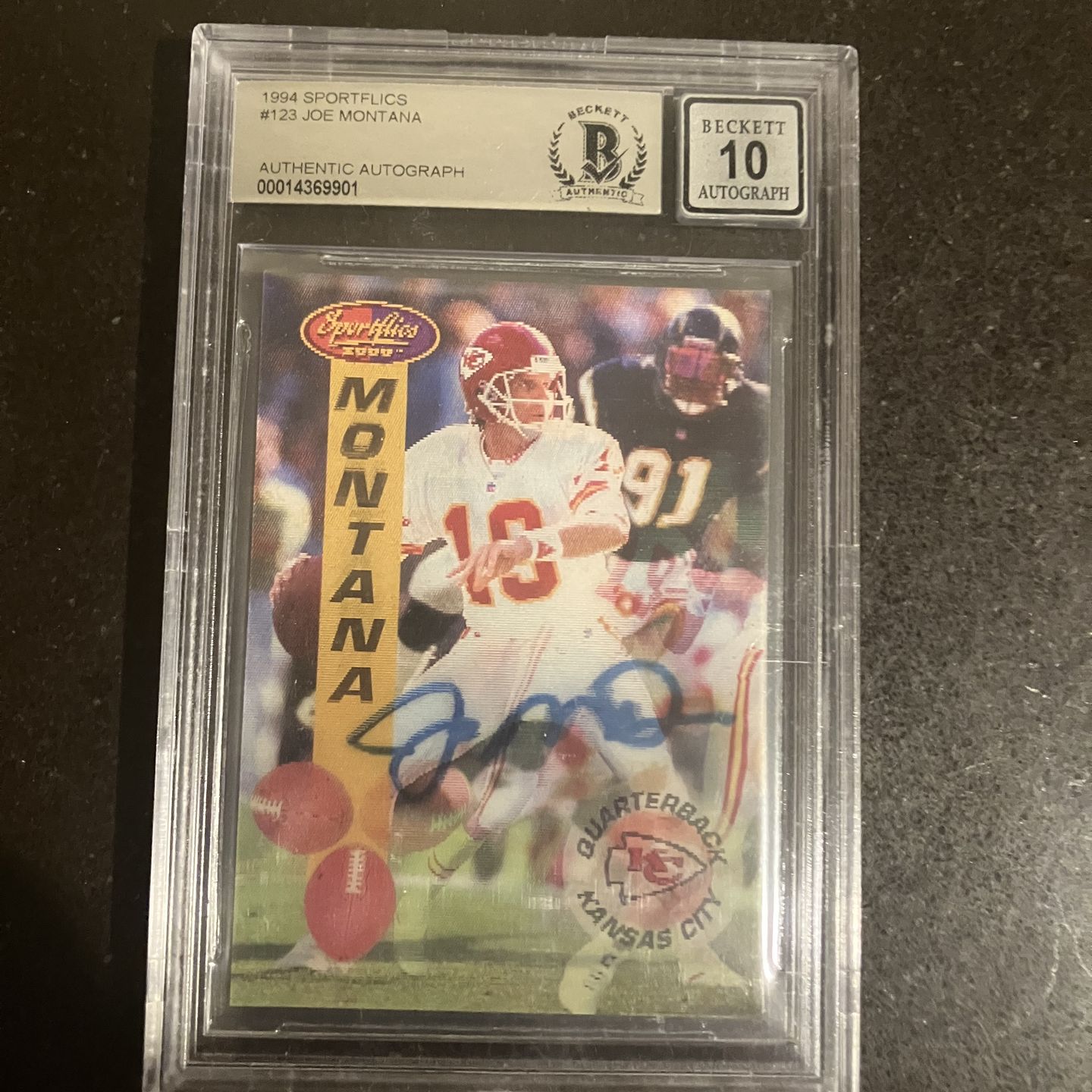 1994 joe montana sportflics autographed chiefs nfl football card beckett auto gem mt 10 Image changing sportflics type card depending on the image angle you see a clear autograph with a changing action shot! Beckett authenticated Beckett 10 slabbed memorabilia