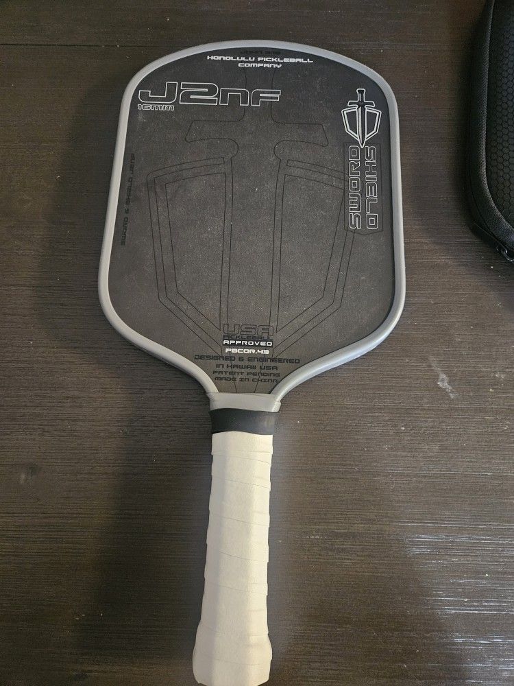J2NF pickelball long handle+ brand new overgrip, roughly used about 2 months. It has a few scuffs but face has amazing grit