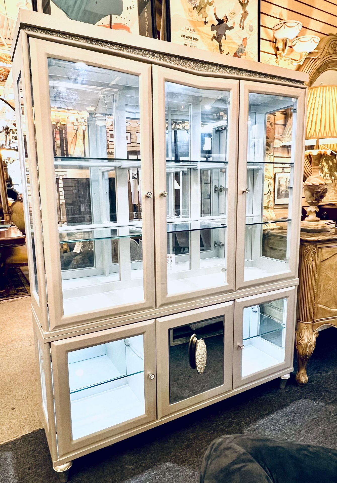 WE HAVE A LARGE INVENTORY IN HIGHEND FURNITURE, WOOD FURNITURE WITH ALL DIFFERENT COLLECTIONS. DINING ROOM SETS, BEDROOM SETS, LIVING ROOM SETS AND MANY OTHER BRANDS LIKE MAITLAND SMITH, VERSACE, BERNHARDT, HENREDON, BENNETTI AND ALSO ITEMS TO COMPLEMENT YOUR HOME DECOR, ACCESSORIES, PERFUM, JEWELRY, CHANDELIERS AND MORE. ASK FOR A VIDEO CALL WITH US!!! FREE DELIVERY UP TO 20 MILES!!! Embrace glamour with a contemporary twist in your dining space with the Melrose Plaza China Cabinet, designed to make your dining room feel picture-perfect. Flip on the LED display lights to illuminate your curated collections, and let the gleaming inside and glittering exterior instantly elevate the luxe and glamorous ambiance of your space. Transform your dining room into a luxurious haven with this stunning piece where functionality meets contemporary glamour. Specifications: - China and buffet body is upholstered in Dove gray textured vinyl - Top cabinets include 2 glass shelves and LED display lighting - Bottom side cabinets include 1 glass shelf each, and LED display lighting - Door pulls feature crystal inserts - Bottom center cabinet features a beveled mirror face and a crystal medallion pull, and contains a velvet lined silverware caddy drawer - Tapered feet are platinum finished and accented with crystals - Upper trim is wrapped with crystal vinyl Dimensions: 60.5''W x 18''D x 77.5''H AICO Furniture designed by Michael Amini has been a TOP name brand since 1988 AICO, which stands for Amini Innovation Corp, features original furniture designs and is known for high quality and intricately designed home furnishing case goods and upholstery. They offer many collections that suit various tastes and styles. Ask for our FINANCE LAYAWAY program!!! 🦊 Additional we have Available FINANCING with Klarna, PayPal, ACIMA And more!!! Available at: Snooty Fox Consignments 840 E Oakland Park Blvd Oakland Park, FL 33334 754.206.20.77