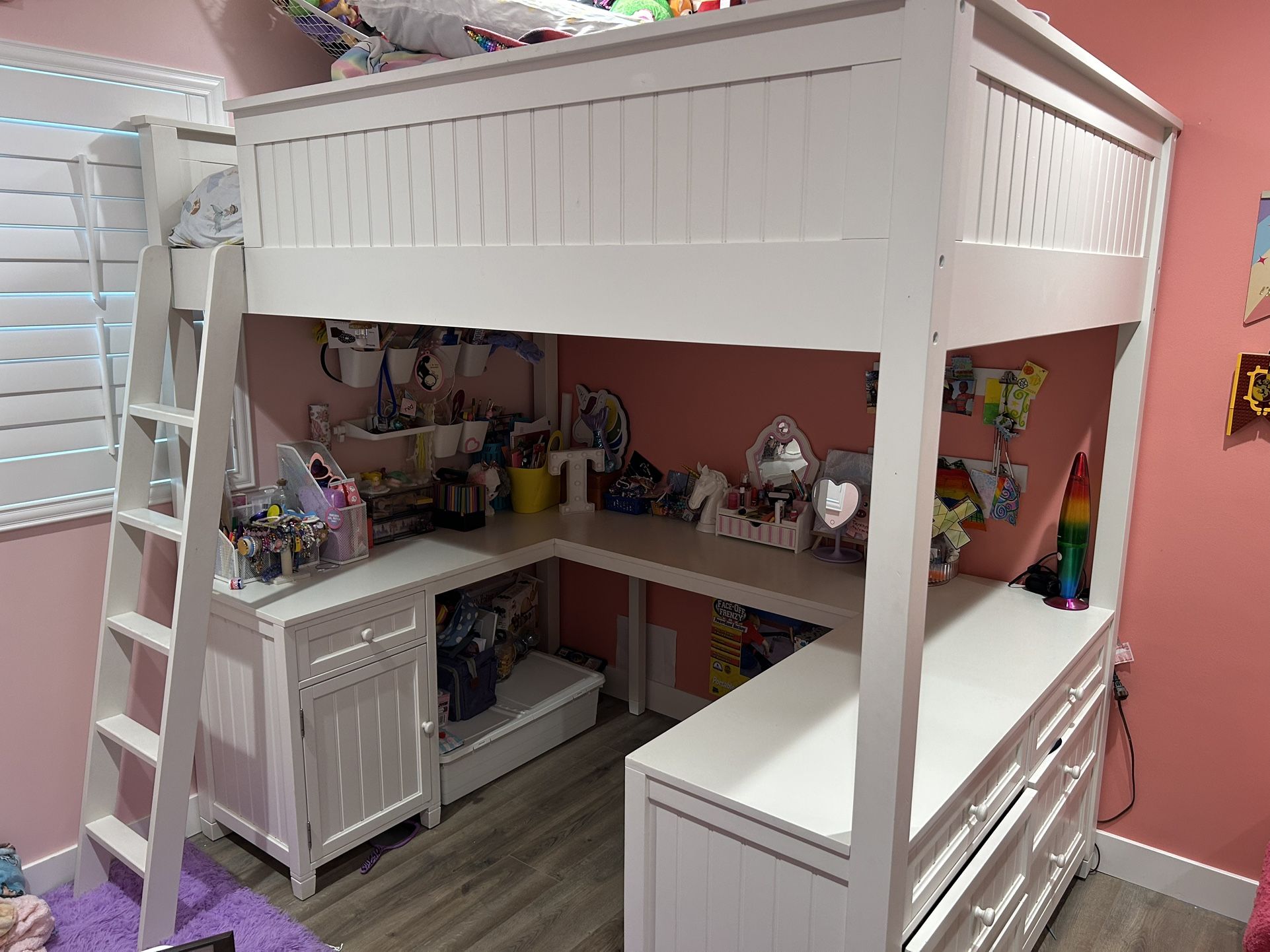81” L x 57.5 W x 76.5 H Very sturdy and nice bunk bed for full size mattress with dresser and desk underneath