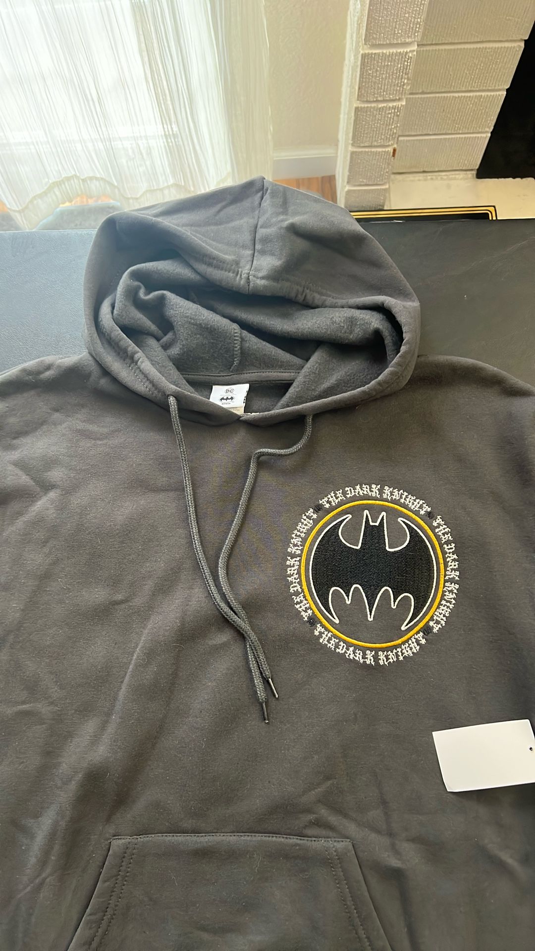 MENS BATMAN PULLOVER HOODIE JACKET AVAIL IN SIZE XL NEW WITH DEPT STORE TAG, SEWN IN DVC TRADEMARK TAG AND MANUFACTURED BY FREEZE. DEEP GRAY HOODIE. BANDED BOTTOM AND SLEEVE ENDS. LARGE EMBROIDERED BATMAN DESIGN ON BACK AND A CURCULAR BATMAN EMBROIDERED DEDISN IN UPPER FRONT. 60% COTTON/40% POLYESTER.