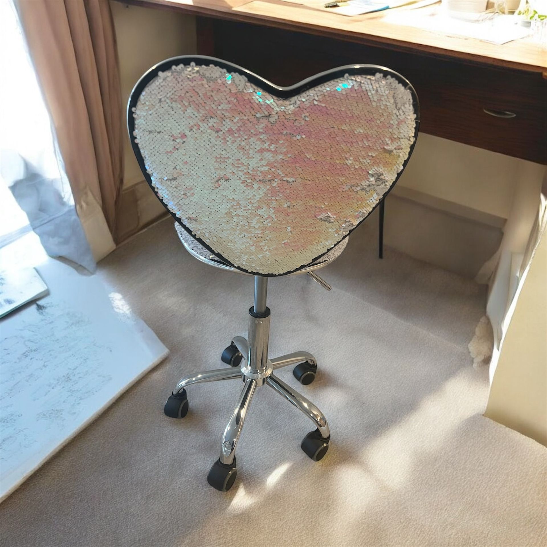 Adorable and unique desk chair or vanity chair. Perfect for Valentine’s Day or girls room! Backside has sequin flip and front side has Sherpa material. In great shape