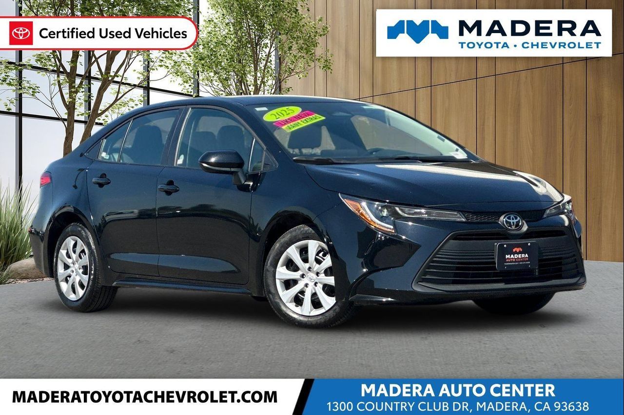 Certified. 2025 Toyota Corolla LE FWD 4D Sedan2.0L I4 DOHC 16VCVTMidnight Black Metallic32/41 City/Highway MPGClean CARFAX. CARFAX One-Owner.Toyota Gold Certified Details: * Powertrain Limited Warranty: 84 Month/100,000 Mile (whichever comes first) from TCUV purchase date * Warranty Deductible: $0 * 160 Point Inspection * Transferable Warranty * Roadside Assistance for 7 Year / 100,000 Mile. Standard New-Car Financing Rates Available. Warranty honored at over 1,400 Toyota dealers in the continental U.S. & Canada. Trade-ins accepted. Trouble-free handling of your transaction, including DMV paperwork * Limited Warranty: 12 Month/12,000 Mile Limited Comprehensive Warranty: 12 Month/12,000 Mile (whichever comes first) from certified purchase date * Vehicle History * Roadside AssistanceToyota Gold Certified Certified, 4-Wheel Disc Brakes, 6 Speakers, ABS brakes, Air Conditioning, AM/FM radio: SiriusXM, Apple CarPlay/Android Auto, Auto High-beam Headlights, Automatic temperature control, Brake assist, Bumpers: body-color, Delay-off headlights, Driver door bin, Driver vanity mirror, Dual front impact airbags, Dual front side impact airbags, Electronic Stability Control, Emergency communication system: Safety Connect (up to 10-year trial subscription), Exterior Parking Camera Rear, Fabric Seat Trim, Front anti-roll bar, Front Bucket Seats, Front Center Armrest, Front reading lights, Front wheel independent suspension, Fully automatic headlights, Illuminated entry, Knee airbag, Low tire pressure warning, Occupant sensing airbag, Outside temperature display, Overhead airbag, Panic alarm, Passenger door bin, Passenger vanity mirror, Power door mirrors, Power steering, Power windows, Radio data system, Radio: 8"" Toyota Audio Multimedia, Rear anti-roll bar, Rear seat center armrest, Rear side impact airbag, Rear window defroster, Remote keyless entry, Speed control, Split folding rear seat, Steering wheel mounted audio controls, Tachometer, Telescoping steering wheel, Tilt steering wheel, Traction control, Trip computer, Wheels: 16"" Steel with Covers.