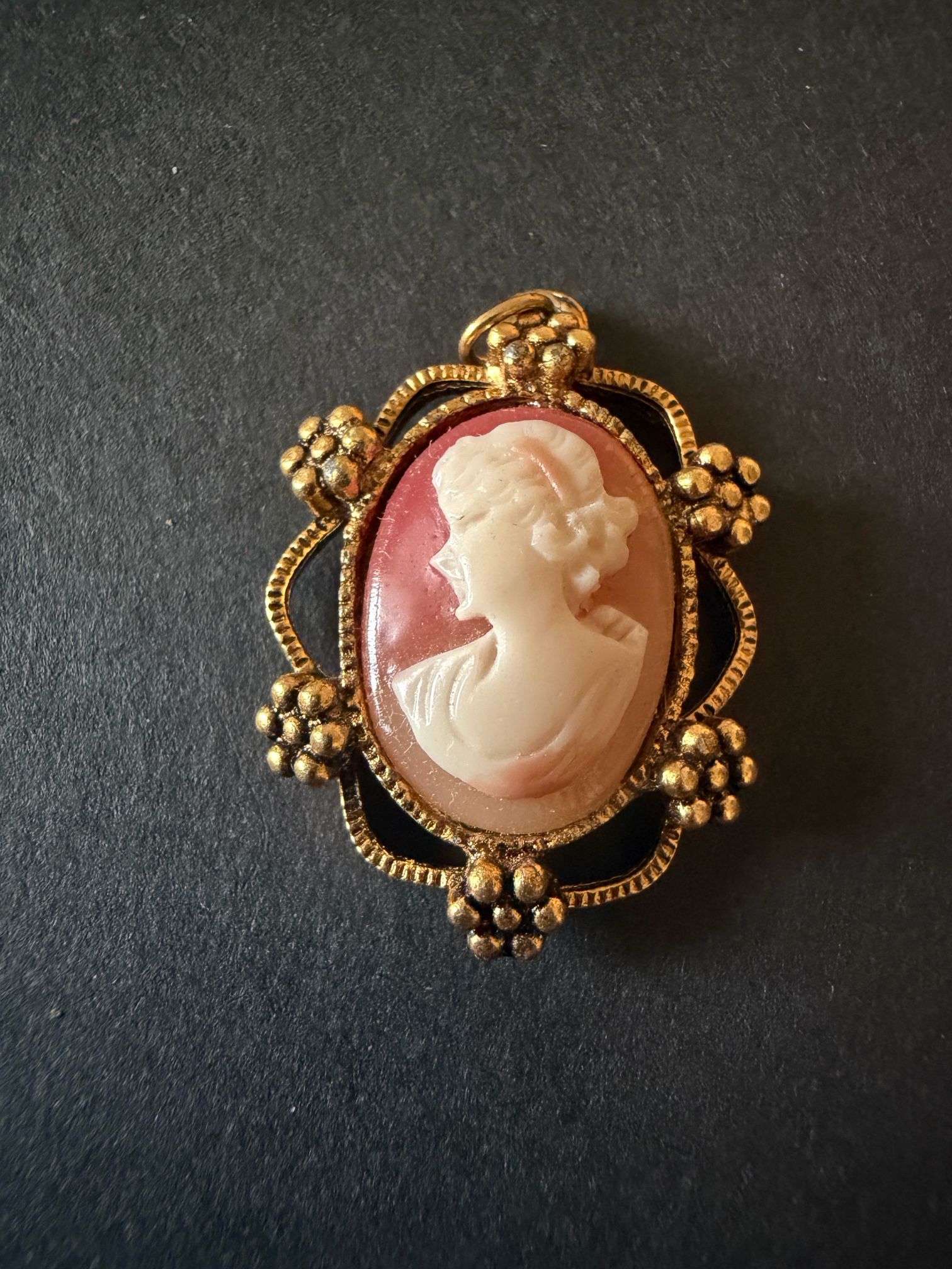 This vintage faux shell cameo brooch features an ornate gold-tone setting, making it a beautiful and elegant accessory for women. The oval shape of the main stone adds a classic touch, perfect for occasions like Mother's Day or anniversaries. The vintage design with its original shell material and gold color gives it a timeless and sophisticated appeal, ideal for adding a touch of beauty to any outfit.