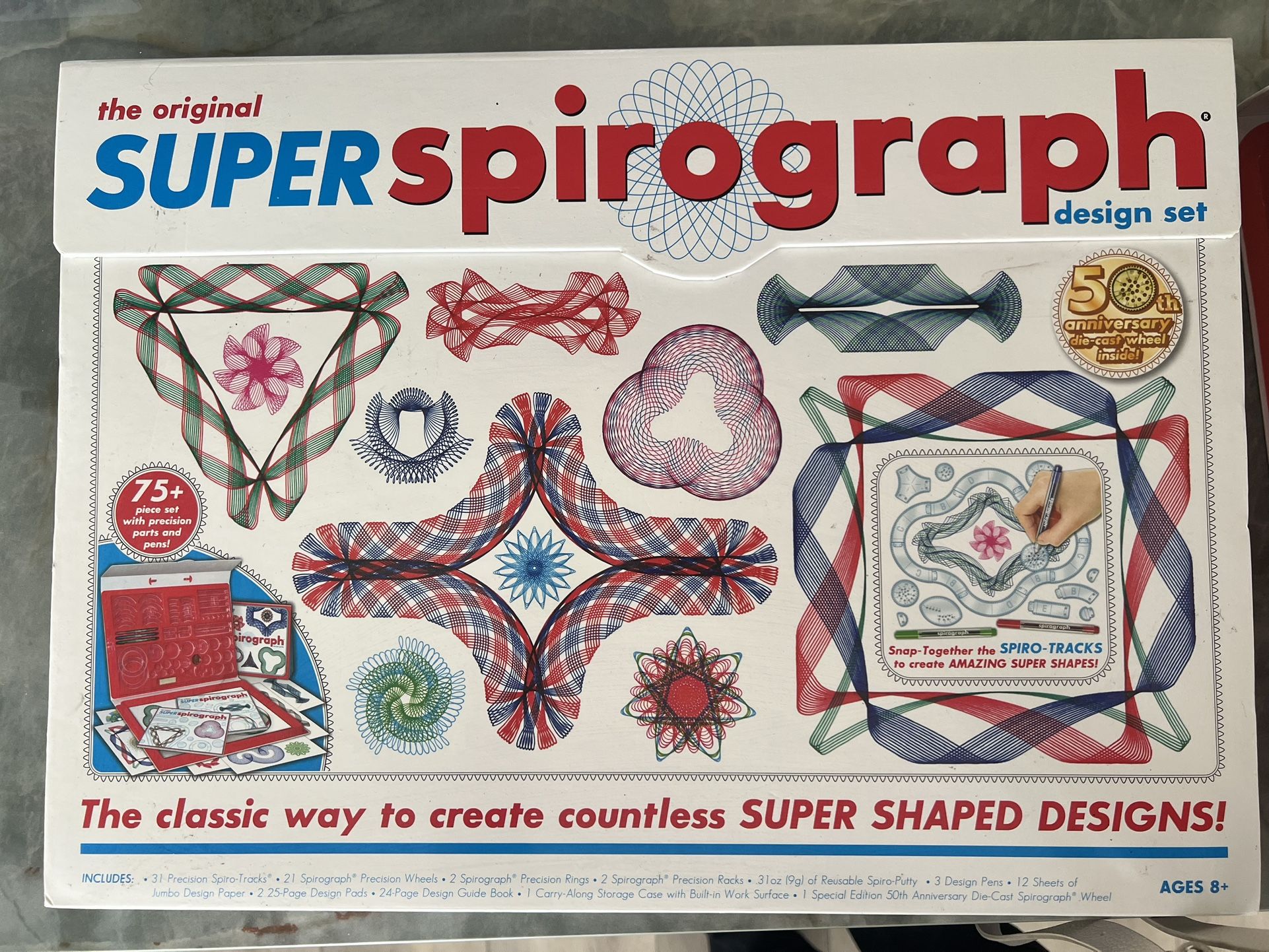 One LIKE NEW set and 1 USED set! This is their 50th Anniversary kit! The one with the limited edition gold wheel. Some 50th editions do not have it. The metal wheel is far superior to the plastic and just fun and pretty to use! Super Spirograph has more pieces plus you can create your own configurations with snap together parts. And the books are amazing for showing just how much you can do. I had no idea each wheel was numbered for different designs, as well as each hole numbered for variations. This books shows them! I have 2 sets: 1 LIKE NEW for $30 (just missing putty, still with packaging, all pieces intact) 1 USED (missing just a few smaller pieces and putty) for $15 (but gold wheel and books and all larger pieces all still there)