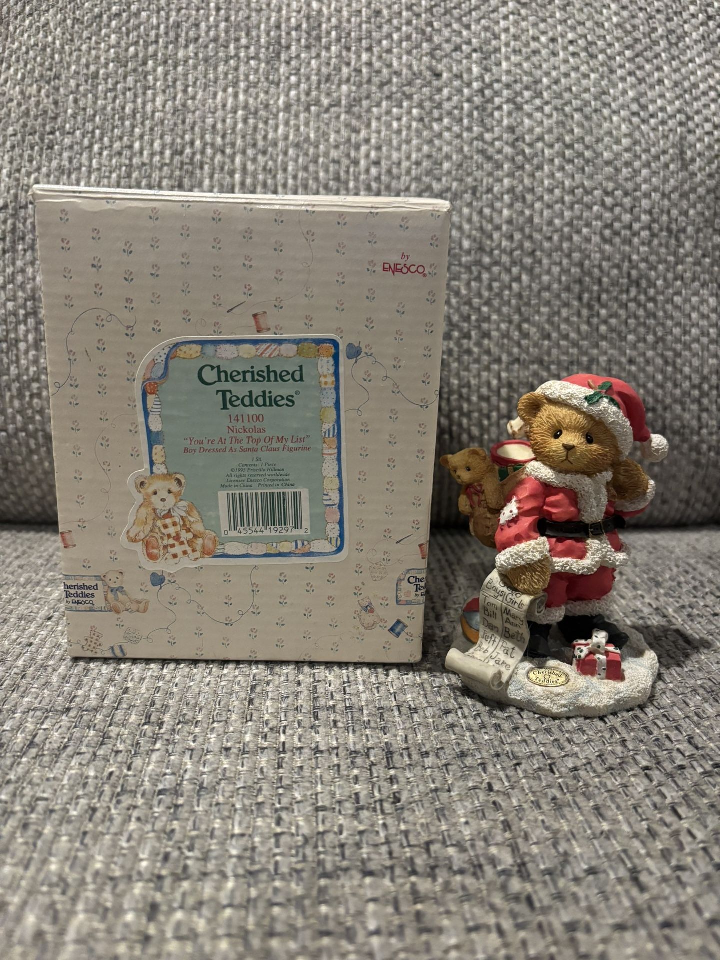 It is a collectible produced by Enesco, created by Priscilla Hillman. The figurine depicts a teddy bear dressed as Santa Claus, holding a list with names. The item number is 141100. The names visible on the list include Tom, Bill, Dan, Beth, Jeff, Pat, Deb, Jake, Genel, and Lisa. Approximately 4 inches in height. Comes in original opened box and with certificate of adoption.