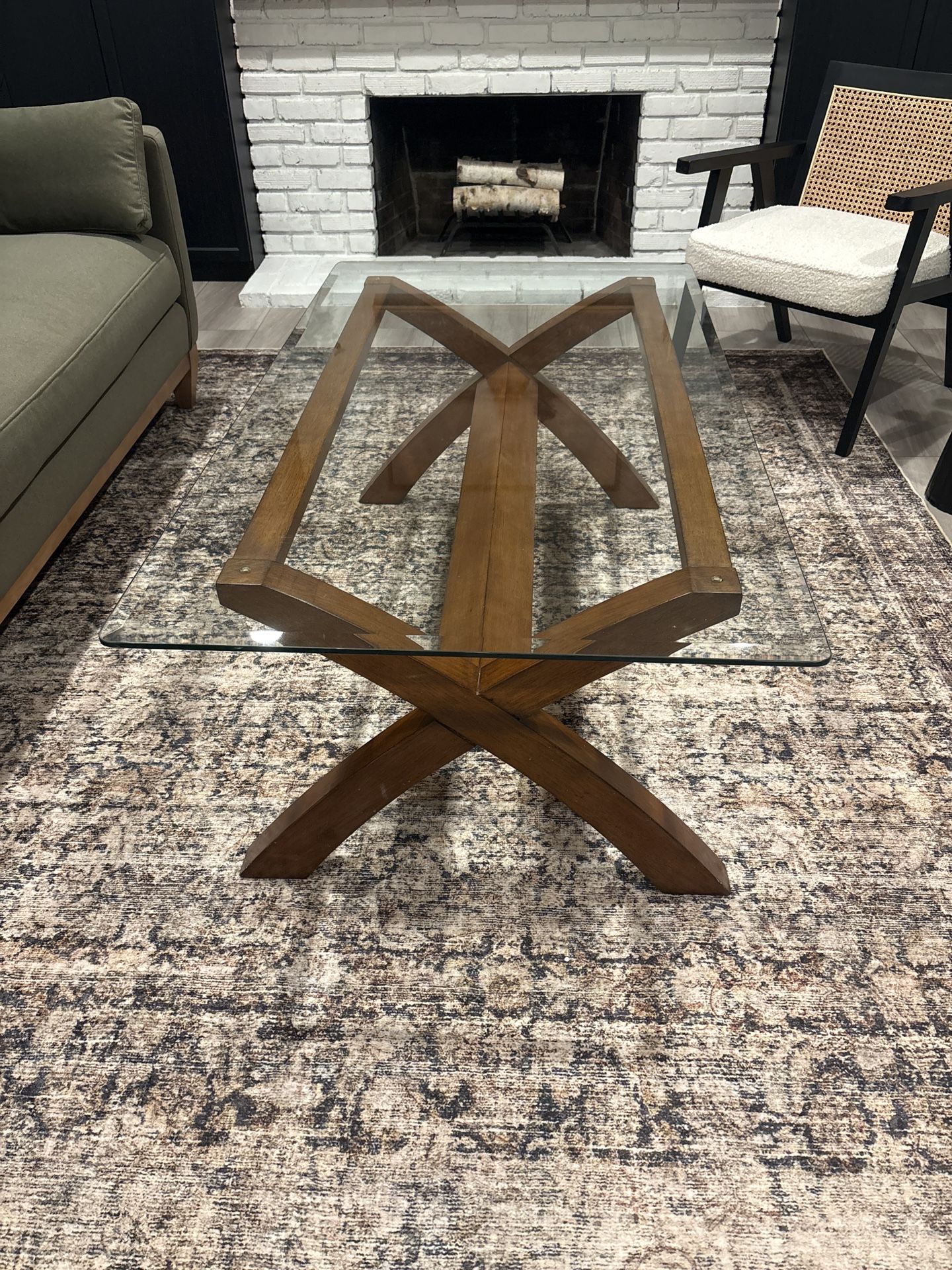 Beautiful mid-century modern style coffee table with a solid wood sculptural X-base and a thick, heavy glass top. The glass is beveled and very sturdy — not the lightweight kind. Dimensions: • 54” long • 30” wide • 20.5” high • Thick heavy-duty beveled glass top Condition is excellent. Only selling because it doesn’t fit our new layout. Pickup only — the glass is heavy, so bringing help is recommended. Price: $200 Cash or Venmo only.