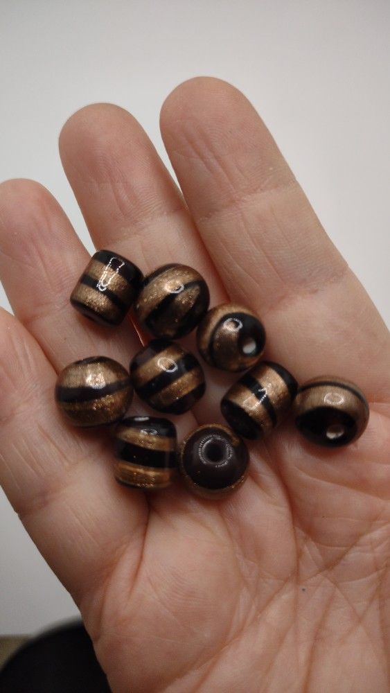 Black or dark amber beads covered in glitter gold swirls.