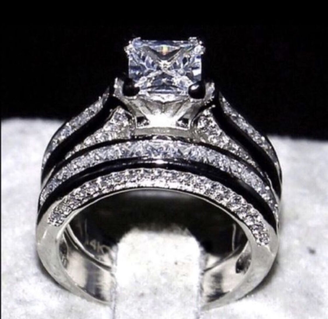 Brand new 18 k white gold filled with lab created diamonds wedding ring set, engagement ring. Available in most sizes! Also have men’s wedding ring, men’s wedding band, bridal set, engagement ring , wedding ring set, necklace, bracelet, ring, cuban chain, Cuban necklace, Cuban bracelet, iced out Cuban chain necklace and bracelet