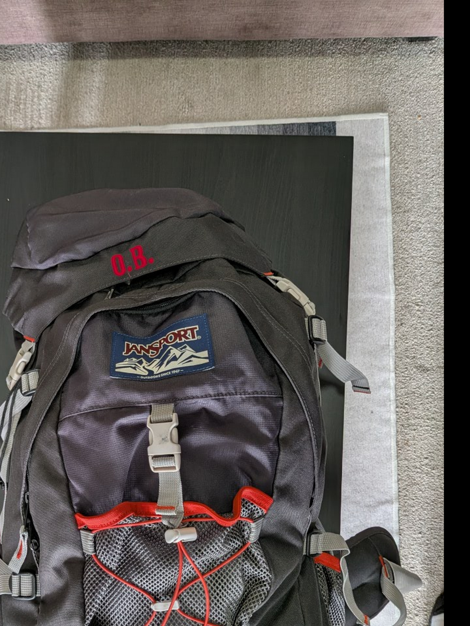 Large hiking backpack This has served me well for many years and it's padding is in great condition. Only flaw is the waterproof sealant on the top interior pocket has eroded away and is flaking(last photo) Pick up only.