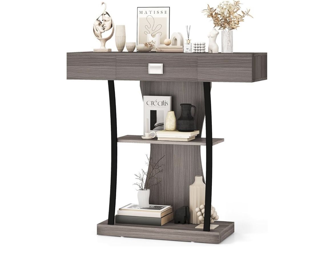 AS IS Newly Assembled Narrow Console Table T-Shaped - Behind Couch Table with Drawer Shelves