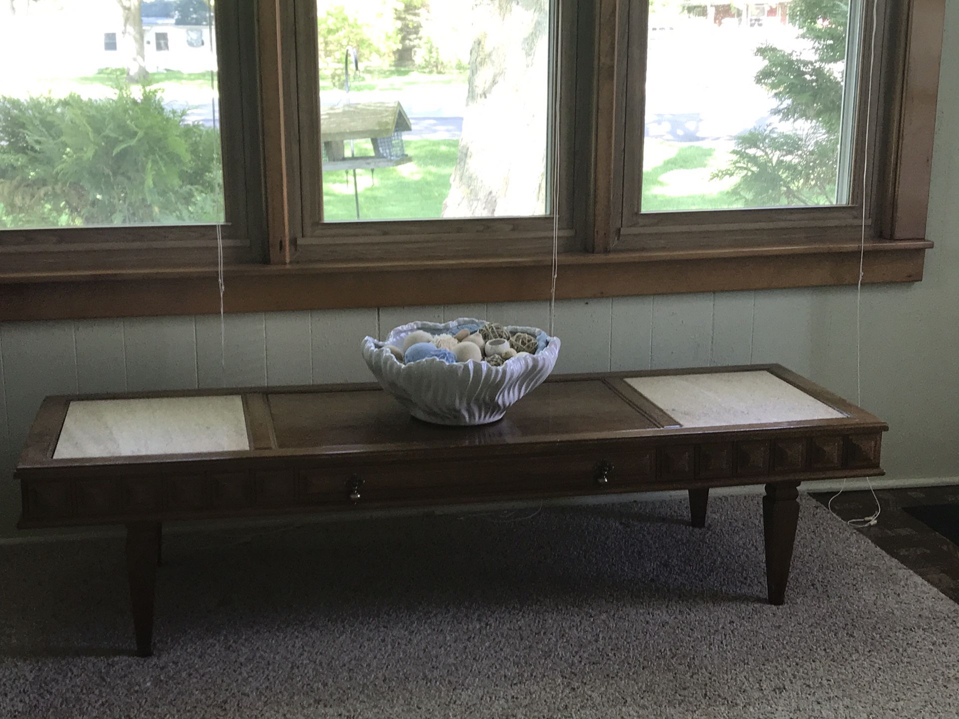 Vintage, unique coffee table with Granite inlays. Comes with two end tables. All tables have drawers. ( white bowl no included )