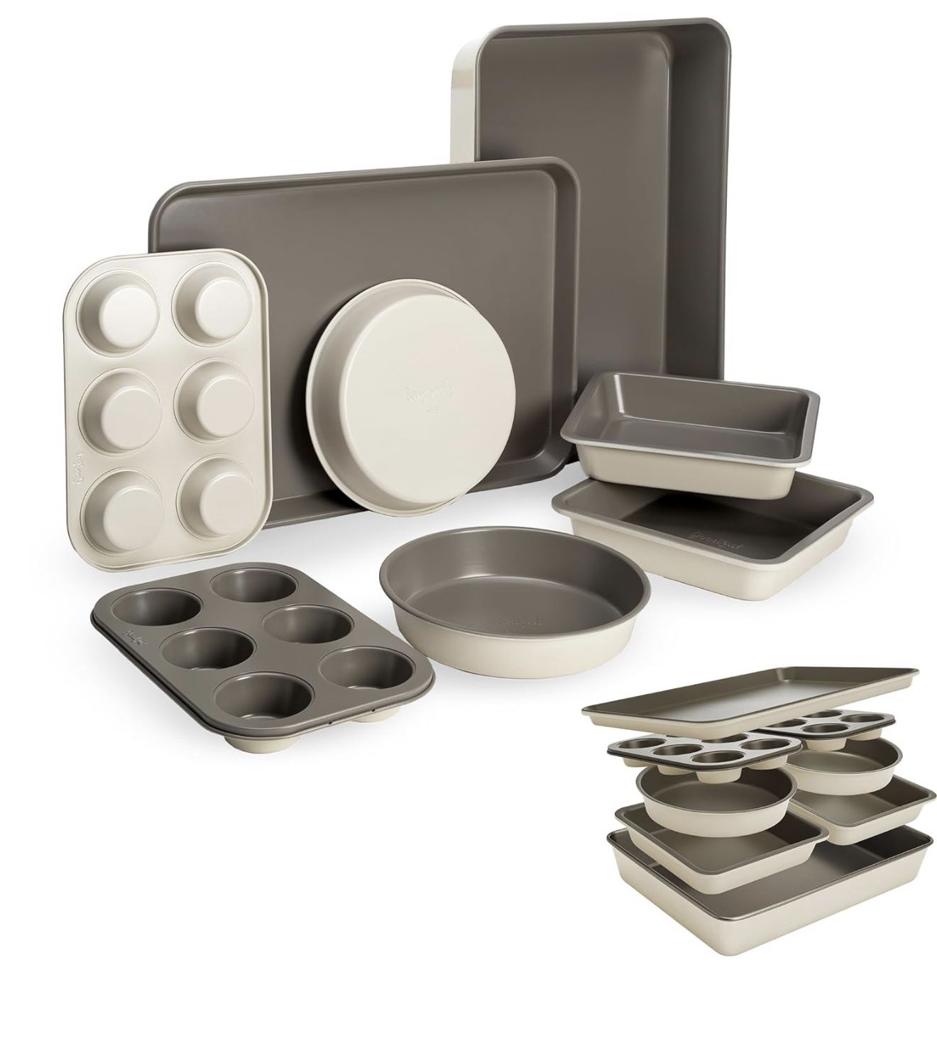 Brand new sealed in box 8 gray & cream piece non-stick bakeware set , easy to clean , dishwasher safe Includes : 2 square cake pan , 2 round cake pan , 2 6 cup muffin pans , baking sheet & roasting pan