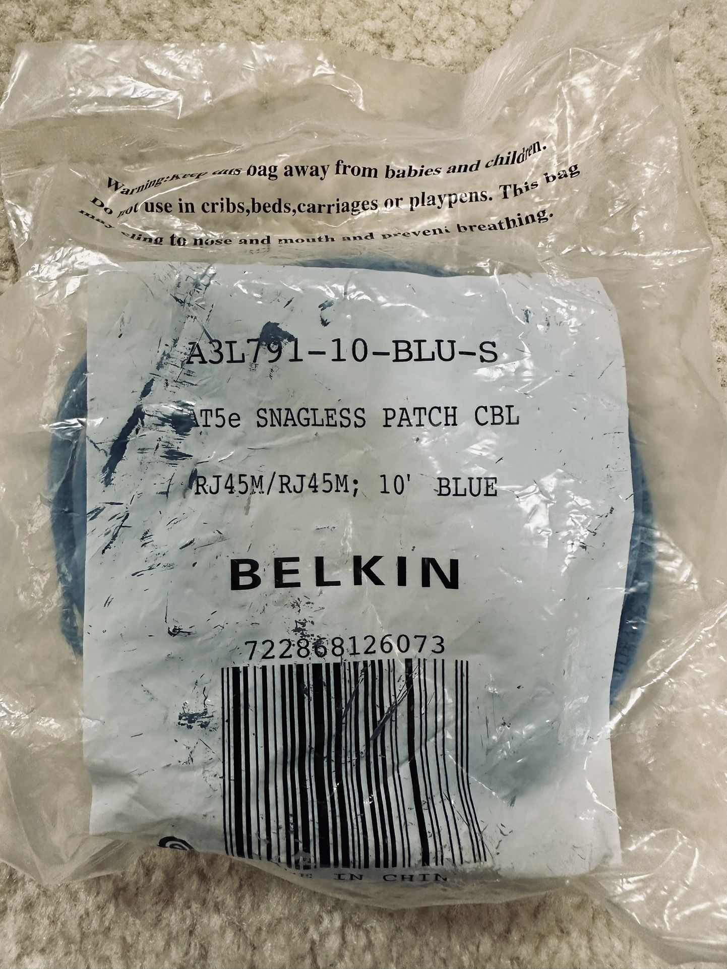 Brand new Belkin cat 5e RJ45 Ethernet cable, 10’ length, $3 each, have 3 available