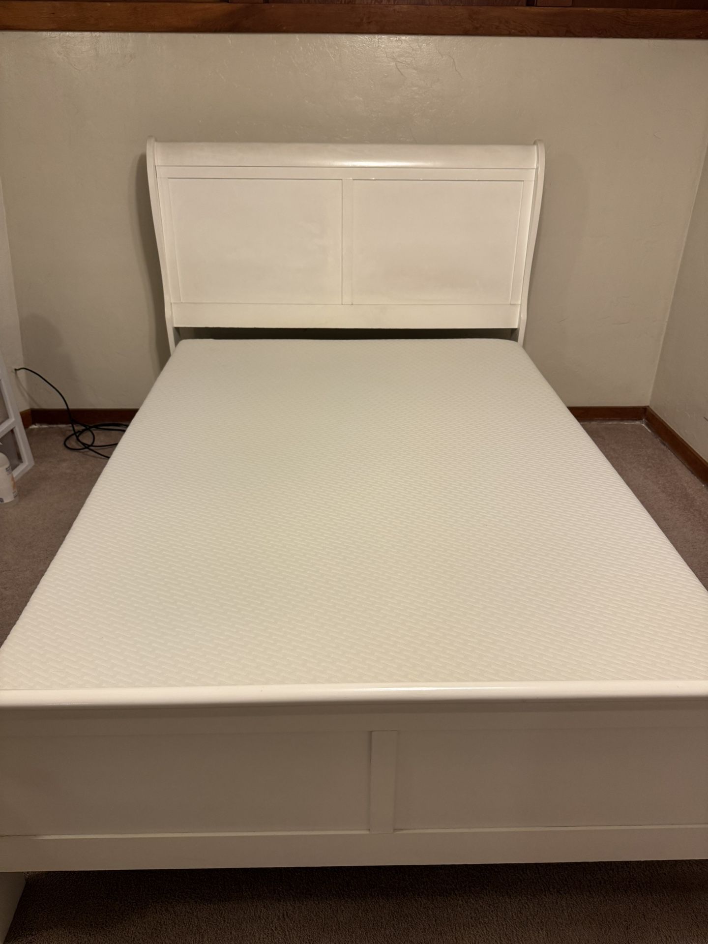 Tufts and needle memory foam mattress used. White bed frame full size used. Pick up only Bed frame $70 Mattress $50 Pick up by December 28th
