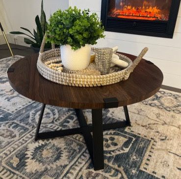 New Dark Walnut Round Coffee Table with Black Industrial Metal Base