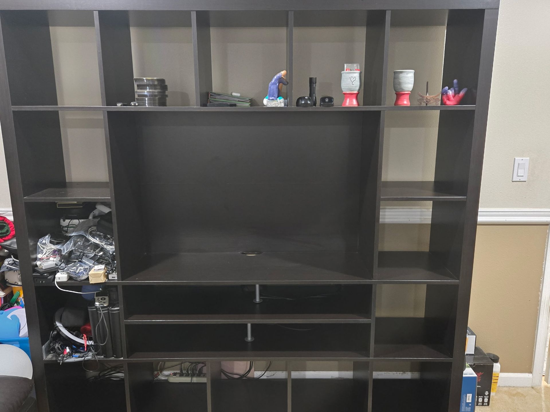 An IKEA Kallax TV stand with storage around it. Dimensions 72.5 tall 72.5 wide 15.5 depth It can have 16 boxes in the cubes. Boxes are roughly 13.25" x 13.25" - not included. Tv space 41 x 27 it fits a 43in tv in the main large cube.