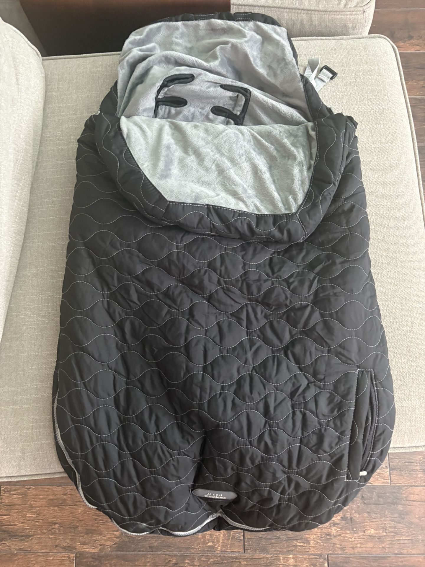 Slightly used one winter like new! No rips or stains. JJ Cole Bundle Me Winter Toddler Car Seat Cover and Bunting Bag - Urban - Weather Resistant Baby Carrier Cover Nice soft plush interior for warmth and outer water snow resistant Great for mountain trips or just winter outings ! 35” long and 18” wide 20$