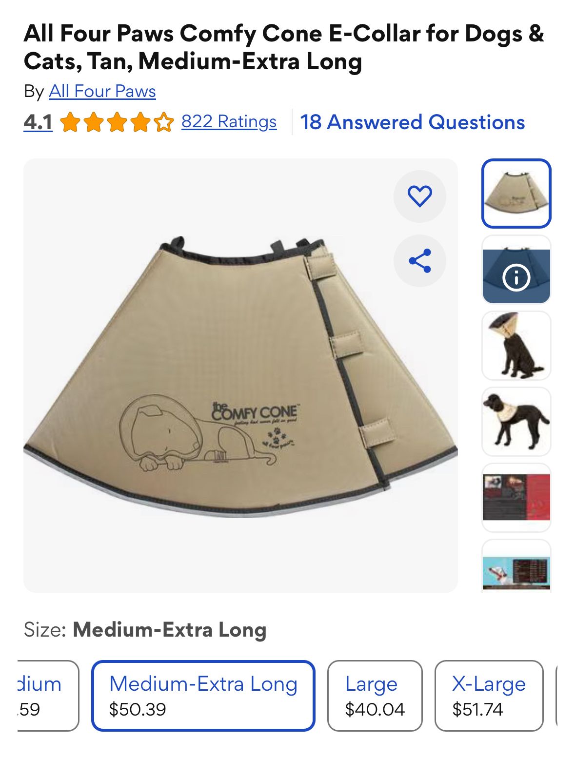 Never Used - Open Box The Comfy Cone E-Collar is a soft, cone-shaped e-collar that helps your pets heal and recover from surgeries, procedures, allergy flare-ups and hot spots in comfort. Foam-backed, padded, tight-gauge nylon that even prevents cats from getting their claws into the material. Opaque inner surface to reduce shadows and distorted views, like blinders for a horse, so pets stay calm. Reversible, inside out and from upright to around shoulders and chest. It has a reflective edge for safety and elastic loops at the neck to thread your pet's collar through for a secure fit at the neck.