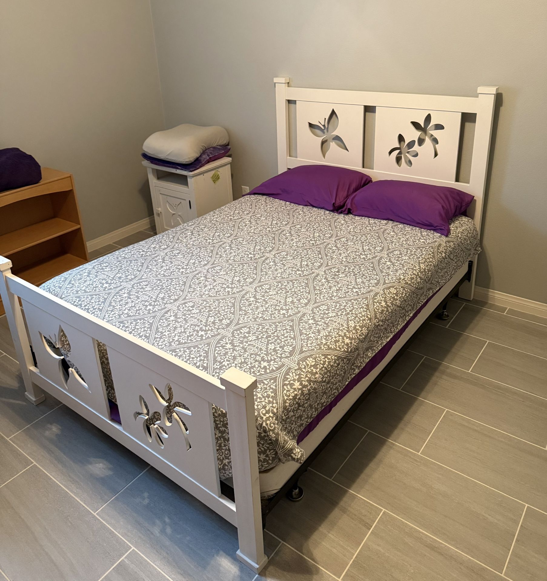 Gently used with minor imperfections. Mattress and box spring also available if desired. Headboard 48” T x 55” W x 2” D Footboard 28” T x 55” W x 2” D