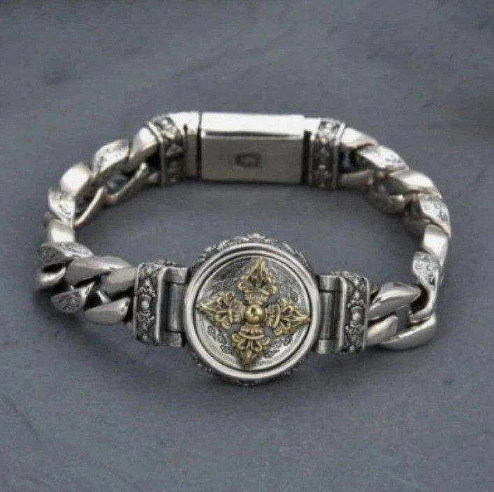 Hi, thank you for considering this Heavy, Solid Sterling Silver Chain 11mm Vajra Curb Link Bracelet is a stunning piece of fine jewelry. At 72g this bracelet is made of high-quality sterling silver with a metal purity of 925, It features a curb link design with a length of 7.1 inches, making it a versatile and stylish accessory. With its sleek silver color and lack of a main stone, this bracelet exudes a sense of luck and sophistication, perfect for both everyday wear and special occasions. A neat feature to this bracelet is the spinning center symbol. Contact me for the best deal and we can negatiate.
