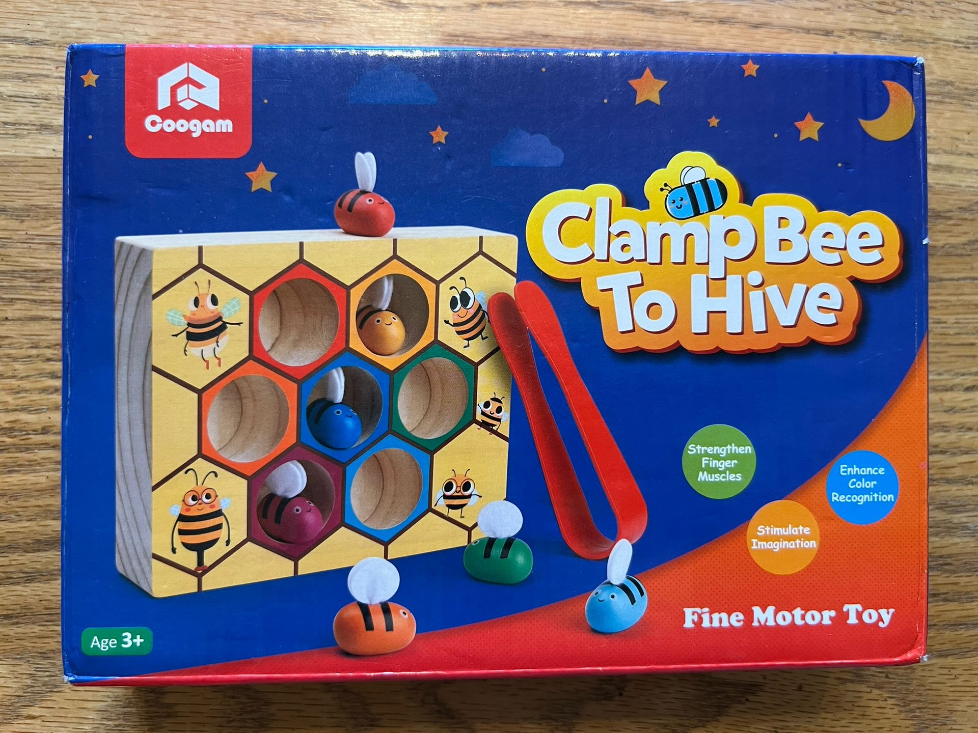 Awesome Coogam Clamp Bee To Hive fine motor toy. This wooden set has a honeycomb board, colorful bees, and red tongs. Great for little ones to work on finger muscles, learn colors, and get their imagination going. For ages 3 and up.