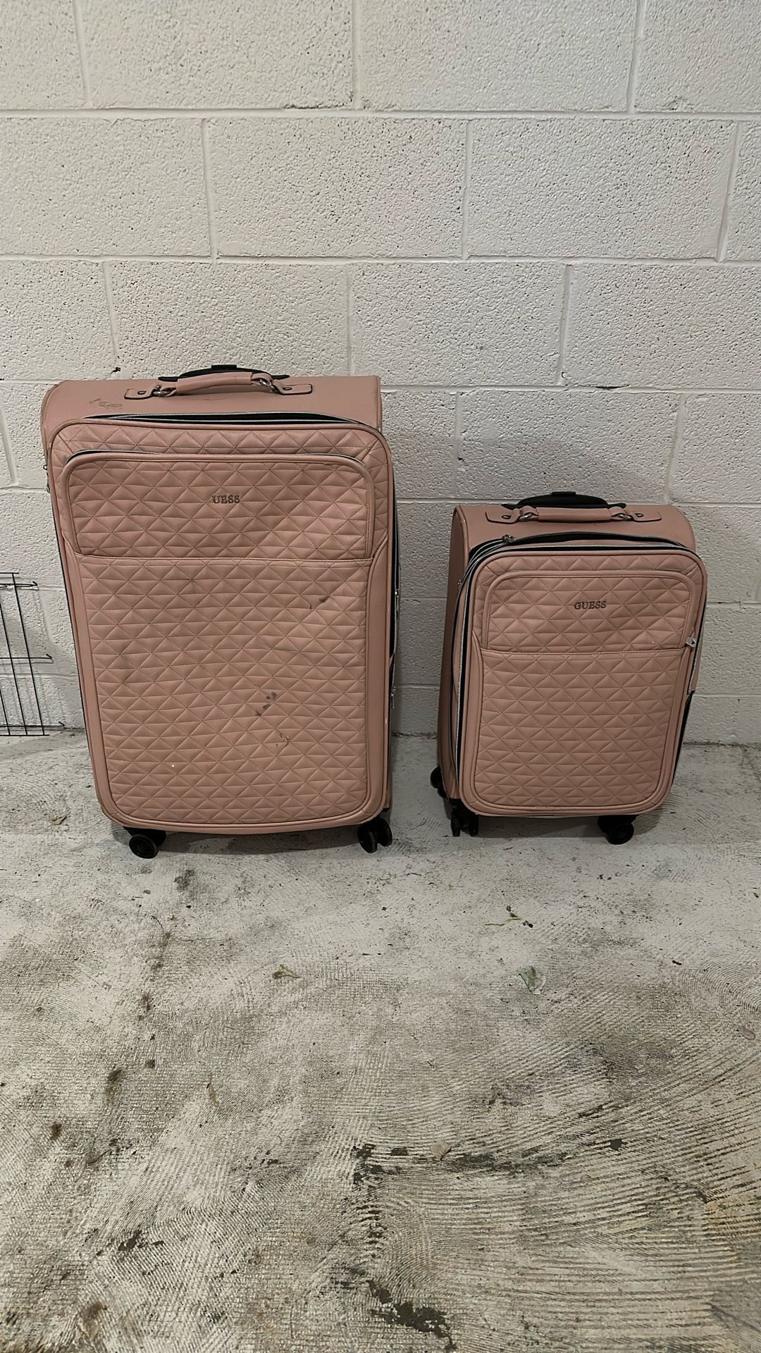 This is a powder, baby pink suitcase, set of two one large, larger, one small, smaller extendable handles, rolling wheels extendable zipper for added room one large pocket in the front that goes all the way down on both pieces. Inside are extremely clean outside. The G is missing off the larger suitcase and there are some marks on the front but all zippers work perfectly smooth. I’ll handles are intact. The rolling wheels work perfect it’s a great starters suitcase or if you’re just traveling somewhere they’re super sturdy. I’ve been on a plane with them three times. They’re absolutely perfect easy to maneuver easy to pack and unpack aside from the blemishes the structure is not affected whatsoever.